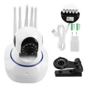 Cámara de vigilancia IP con 5 antenas, nuevo sistema de alcance 5G, alta definición de imágenes, videos y audios. Visión nocturna, almacenamiento de tarjeta memoria (no incluida), soportes mobiles compatible Android/iOS alta gamma (iPhone 11 en adelante). Rotación 355•, ángulo de visión 120• aprox.