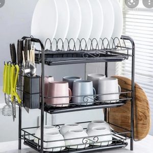 DESCRIPCION: Secador de platos, hecho de hecho de fierro duradero con acabado negro de alta temperatura, ideal para platos, vasos y utensilios de cocina para escurrir el agua después de lavarse. El diseño de 3 pisos permite acomodar diferentes vasos y vajilla como platillos, tazas y mucho más, de forma muy cómoda.