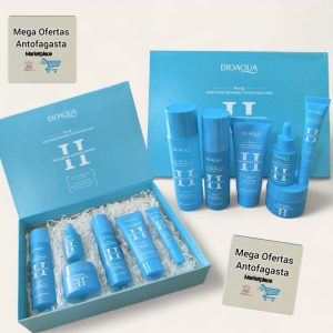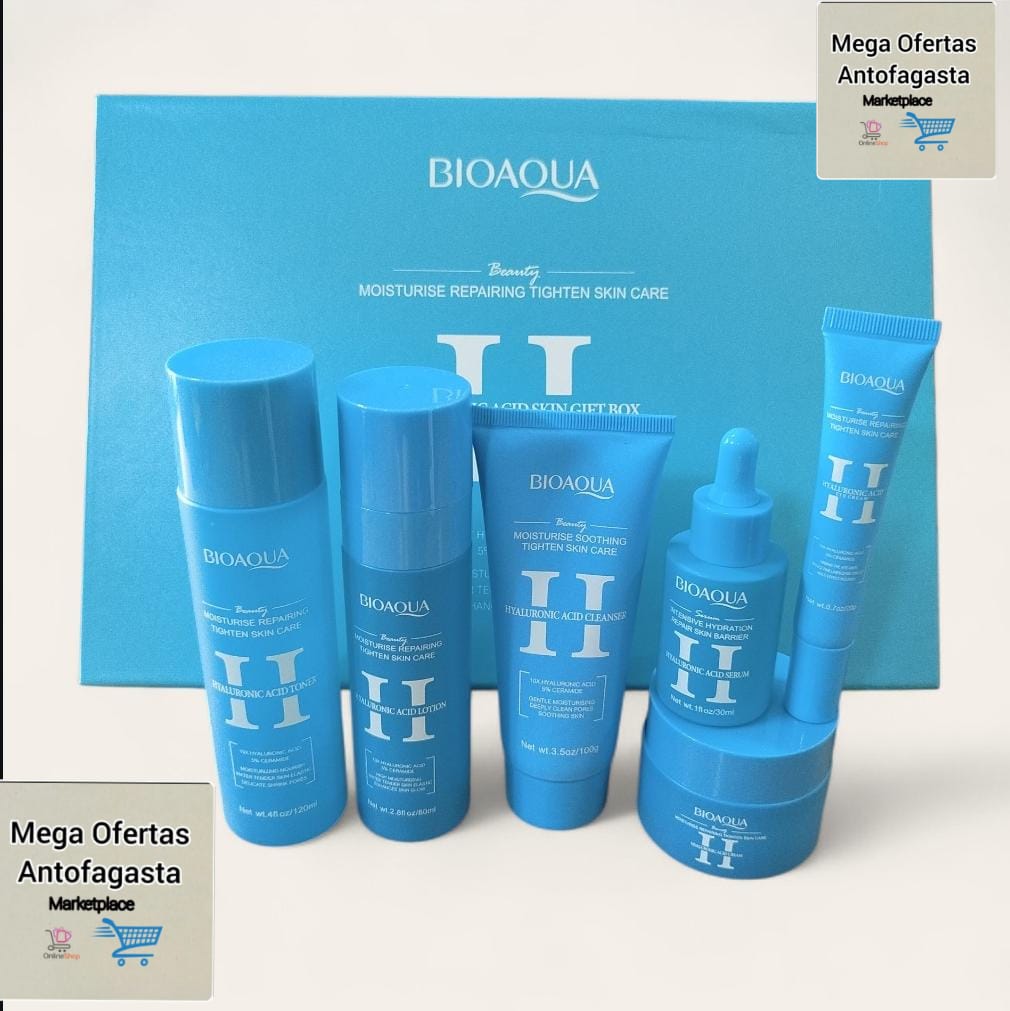 Set de cuidado de la piel con Ácido Hialurónico, incluye 6 productos: limpiador facial, suero facial, crema facial, crema para ojos y tónico.